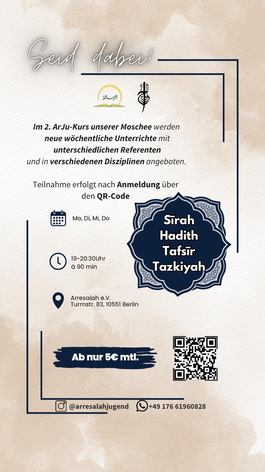 Mit dem Ziel, jungen Muslimen den Zugang zu authentischem islamischem Wissen zu erleichtern, startet ab Juni 2025 der 2. ArJu Kurs mit neuen Modulen in verschiedenen Disziplinen: Sirah, Hadith, Tafsir und Tazkiyah. Dabei möchten wir nicht nur Wissen vermitteln, sondern auch Herzen bewegen und den Glauben stärken – in einer Umgebung, die motiviert und verbindet.